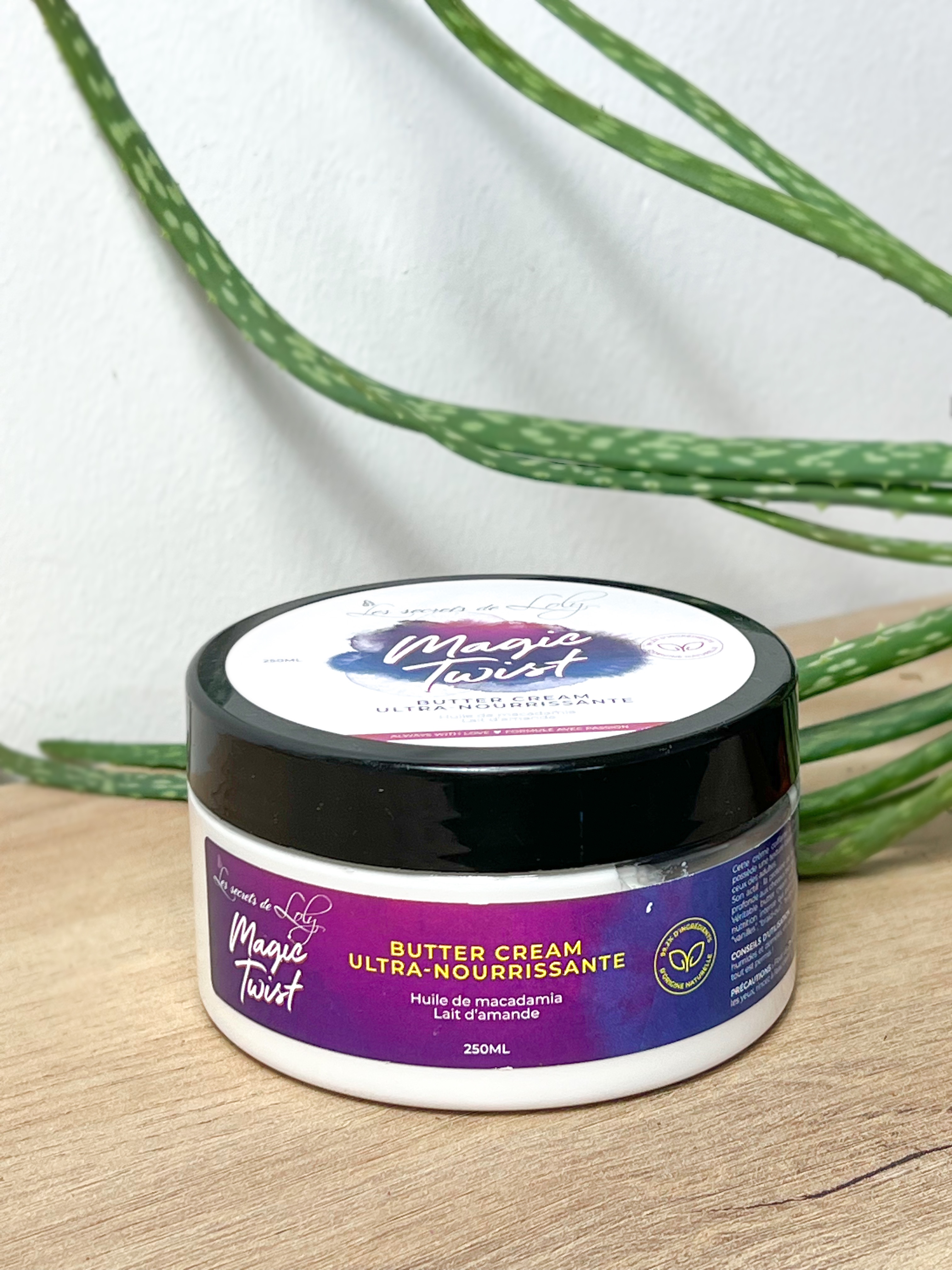 Cette Butter Cream coiffante est riche en huiles et donc ultra nourrissante. Elle est idéale pour les coiffures comme : les vanilles, twist out, braid out, finger coils.