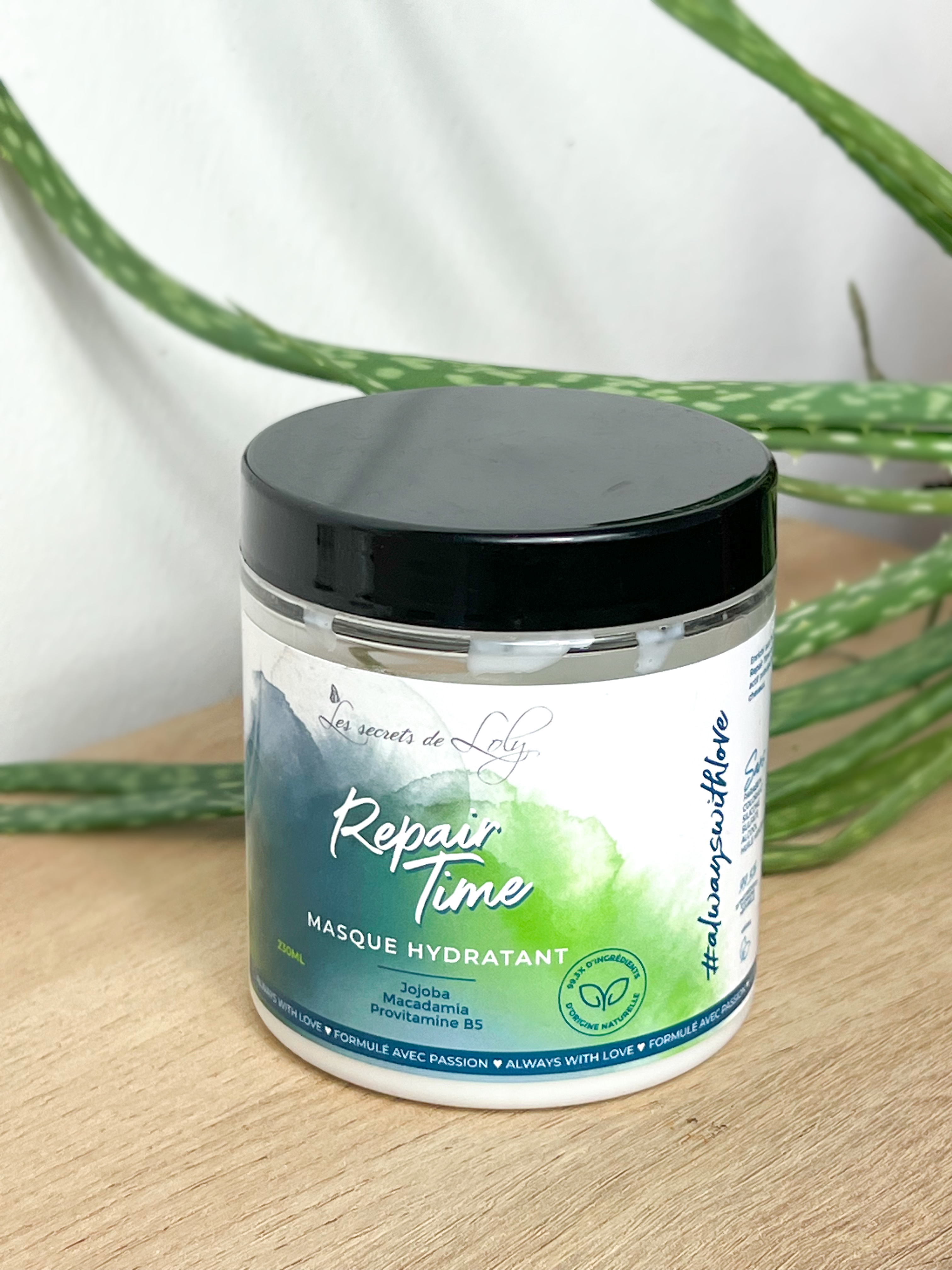 Le Masque crème hydratant Repair Time est élaboré à base d’aloe vera, de macadamia, de jojoba, de glycérine, de provitamine B5 et des huiles essentielles de bois de rose et de pamplemousse.